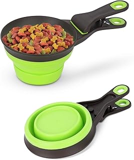 DHAWS シリコン計量カップ ペット 犬 猫用 3イン1 折りたたみ式シーリングクリップ 収納バッグ ペットフードスプーン 1/2カップ/1カップ/2カップ/2カップ容量(118ml/237ml/473ml) グリーン 2カップ (473ml))
