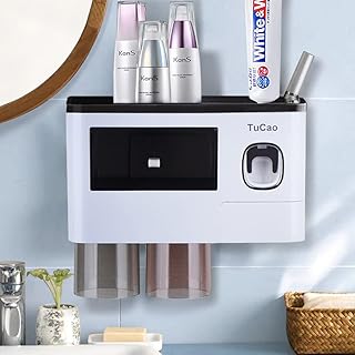 TuCao 自動歯磨き粉ディスペンサースクイーザー 壁取り付け&省スペース歯ブラシホルダー バスルーム用 2つの透明マグネットカップ 6つの歯ブラシスロットとカバー付きコスメオーガナイザー引き出し(2カップ)