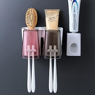 WREWING 歯ブラシホルダー 多機能 2カップ 壁マウント 歯ブラシホルダー 自動歯磨き粉絞り器 省スペースバスルームオーガナイザー 化粧品収納用
